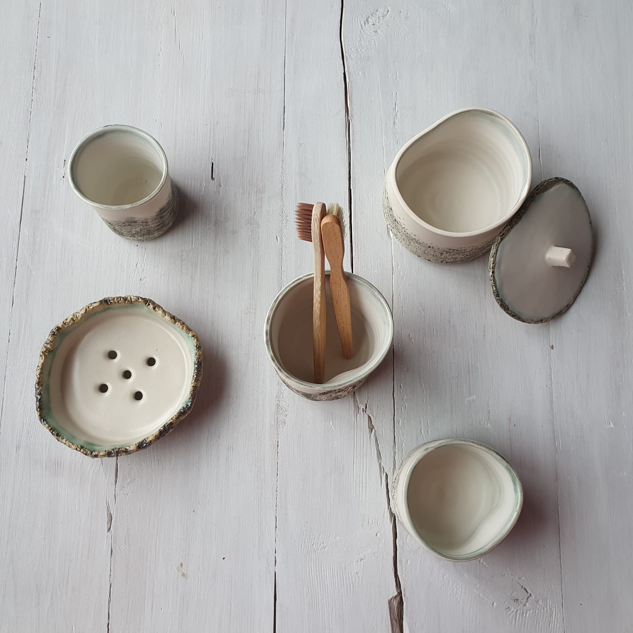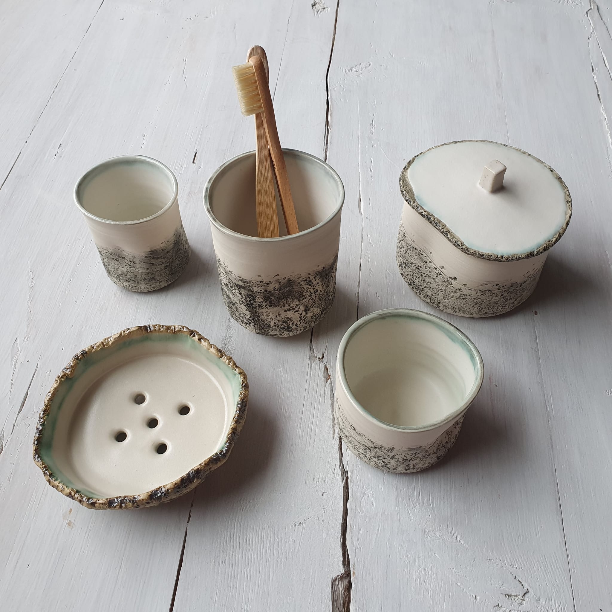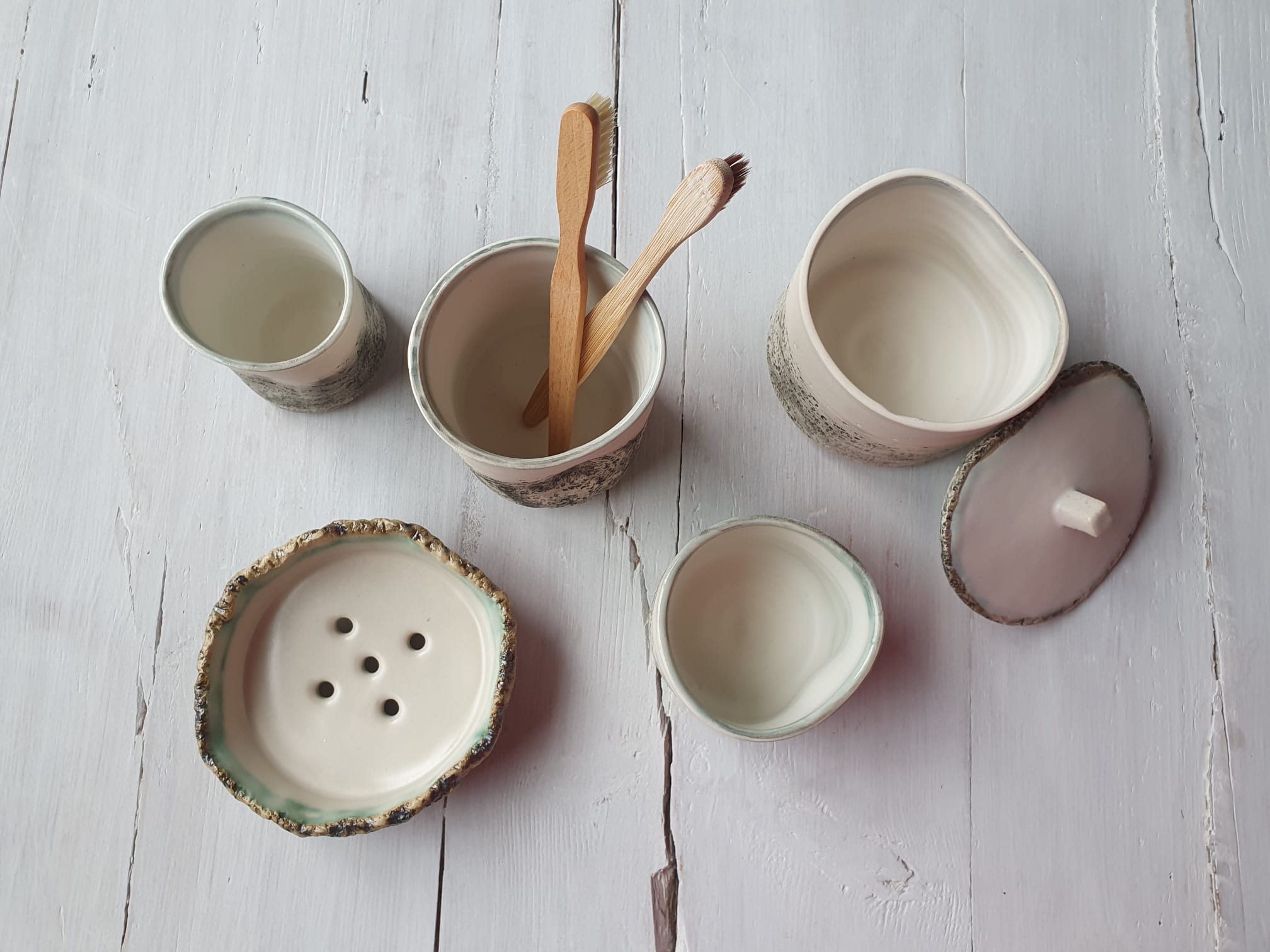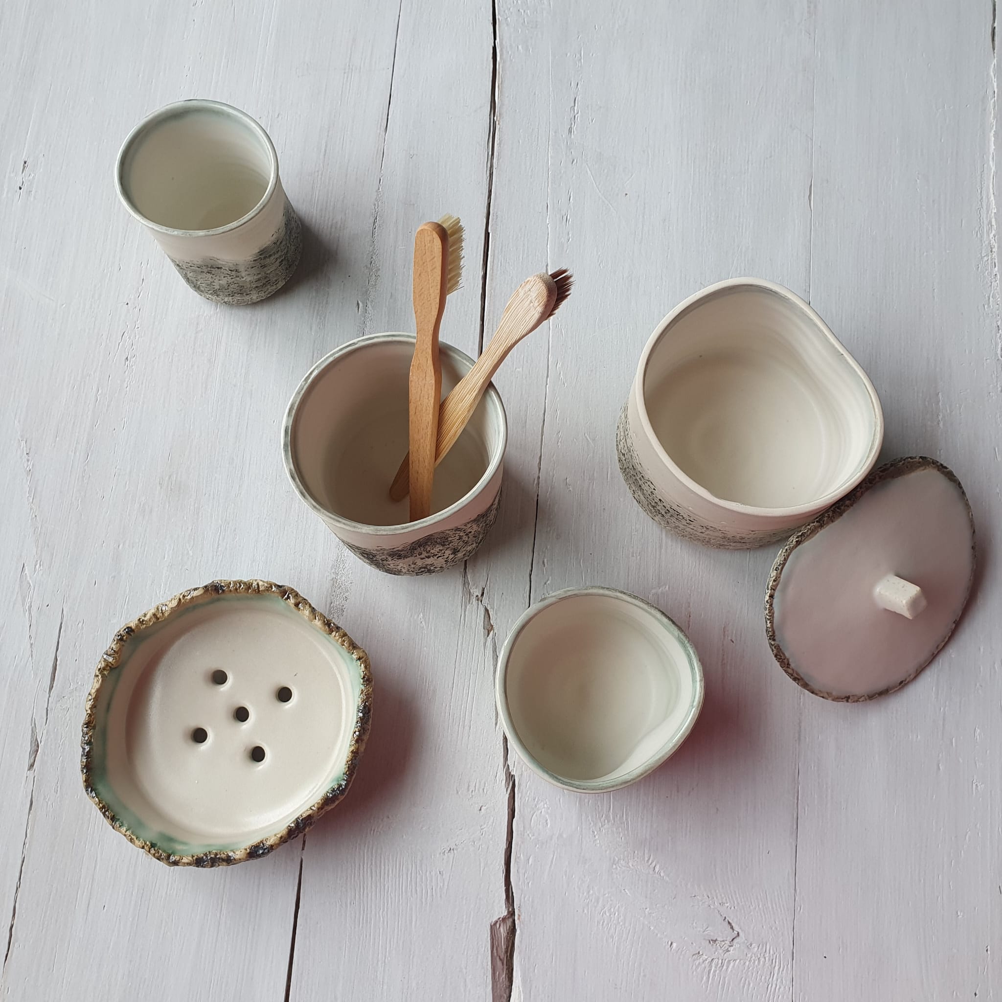 This set includes a cup for toothbrushes, a water cup, a jar with lid for cotton swabs or pads a soap tray and an extra cup for your convenience, in which you might keep scissors or tweezers. This set will surely bring quite elegance to everyday routines—equally at home in the bathroom or on a kitchen counter.