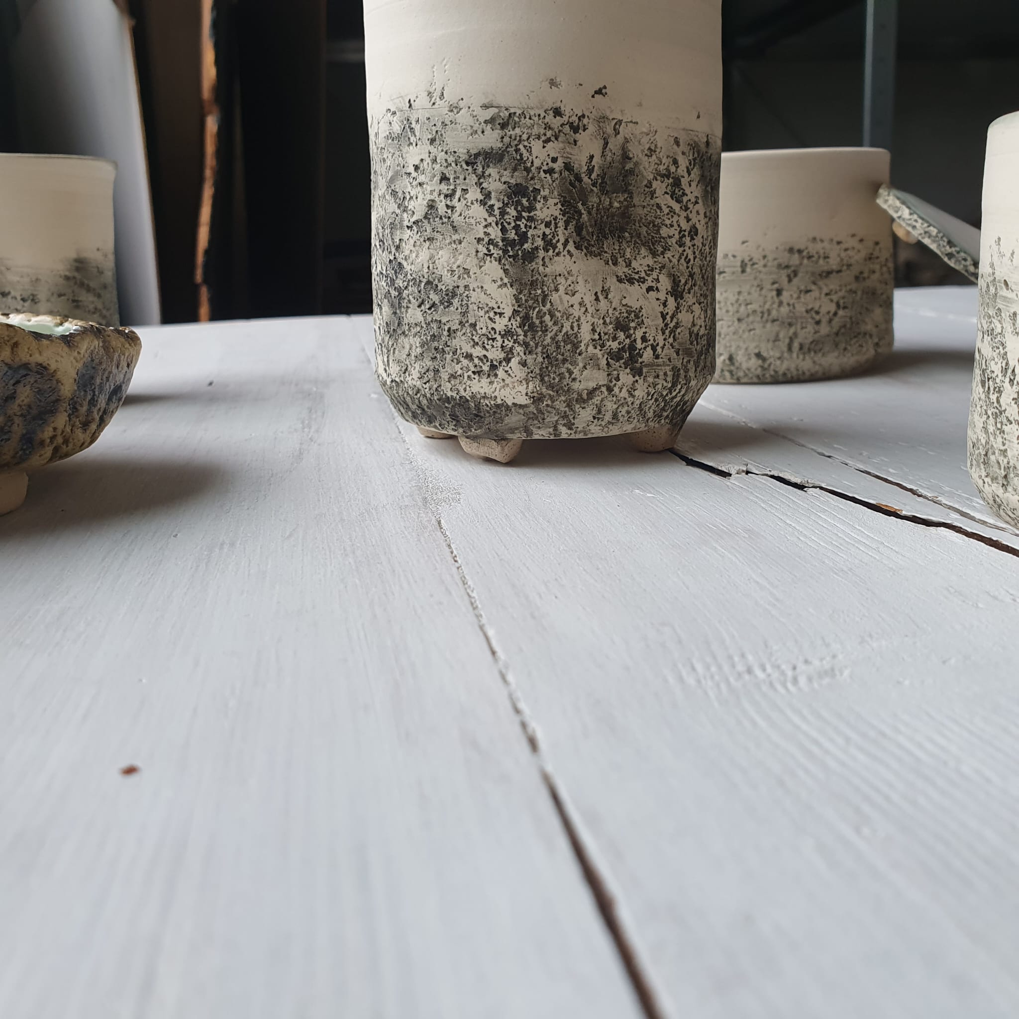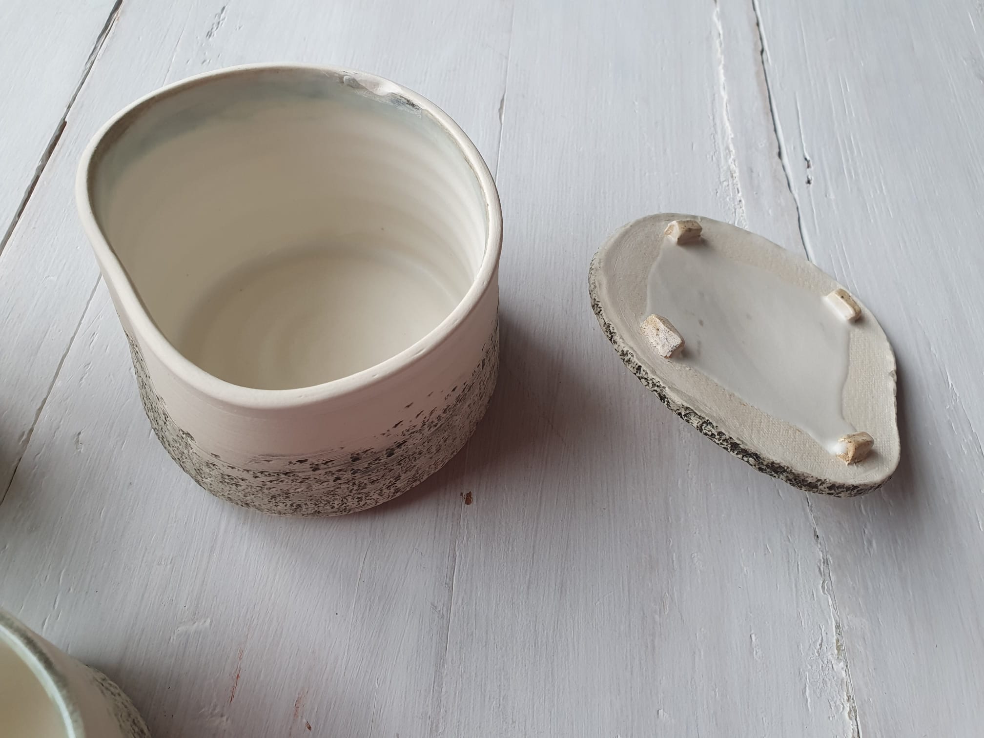 Five stunning pieces, plus one lid, each one of a kind. Both the shapes and the fresh glaze colour with subtle green to turquoise edges are unlike anything I’ve made before.