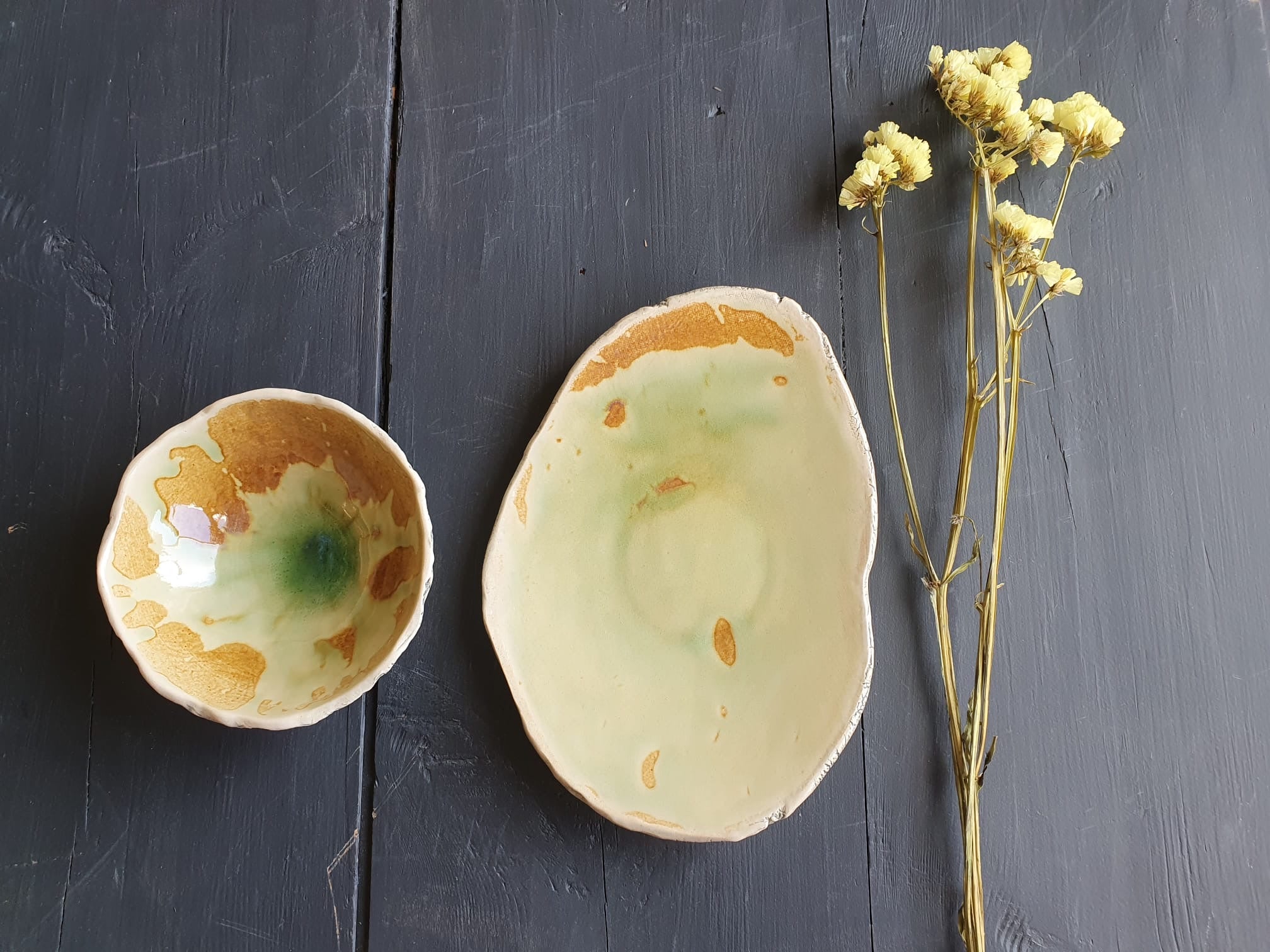 The Terra Duo brings a rich sense of warmth to the table. Hand shaped with a satin green glaze that flows across the surface, each piece reveals soft brown pigments within the glaze that highlight its depth and movement. The free spirit plate offers an inviting backdrop for food, while the small yet sturdy bowl offers space for small bites or a dip. Together they create a grounded and versatile set.