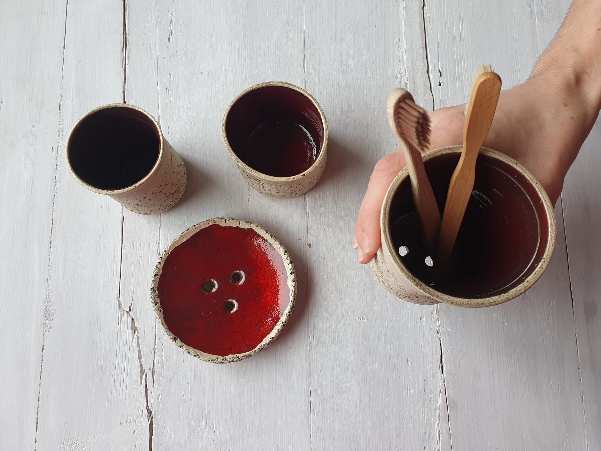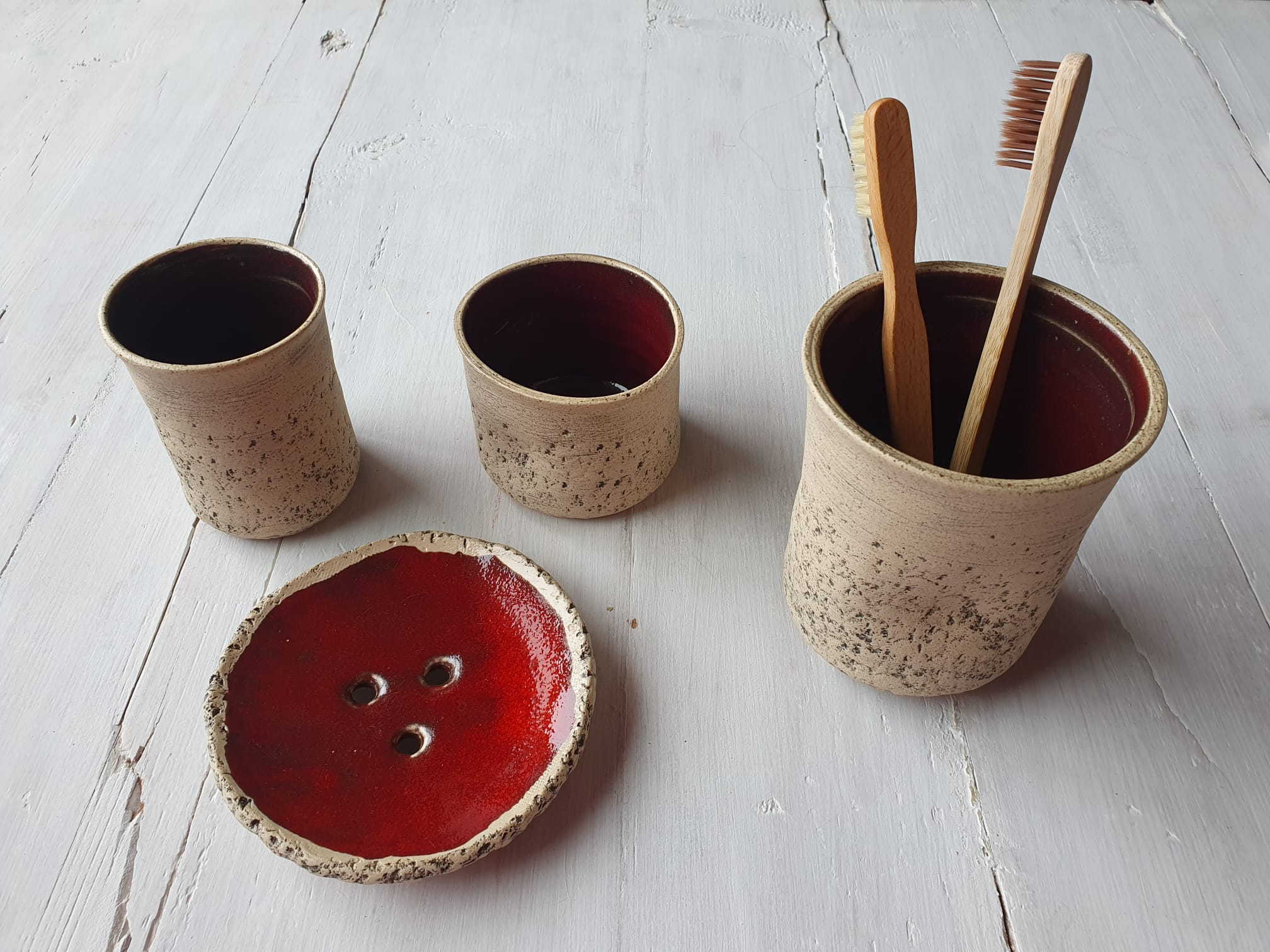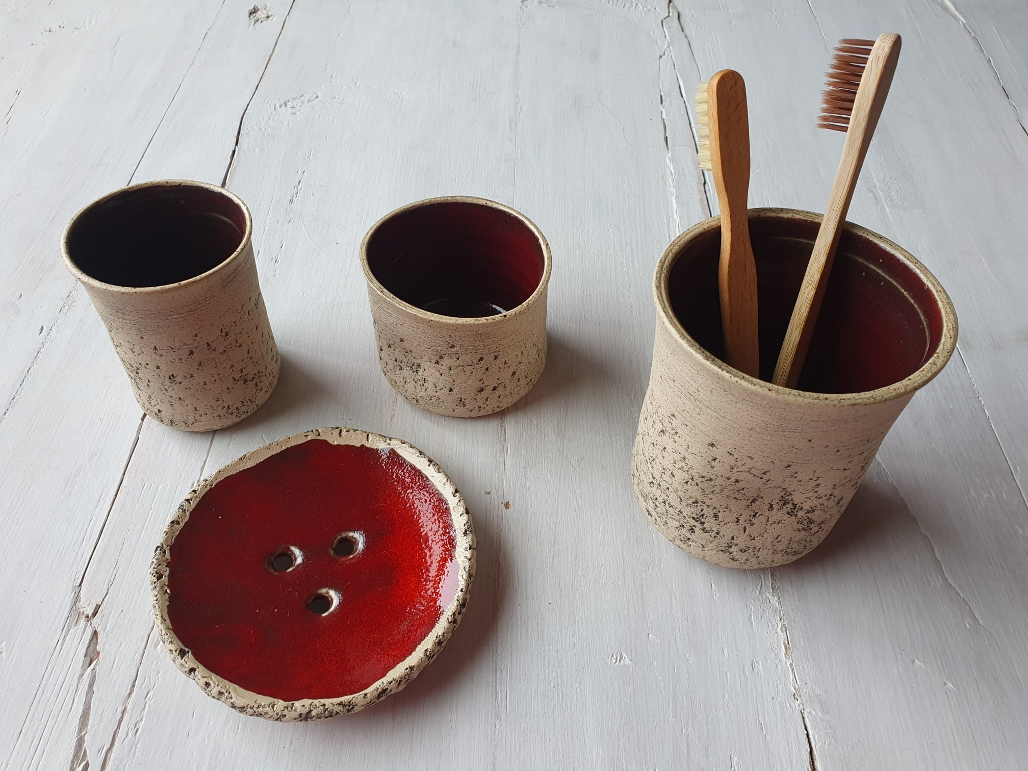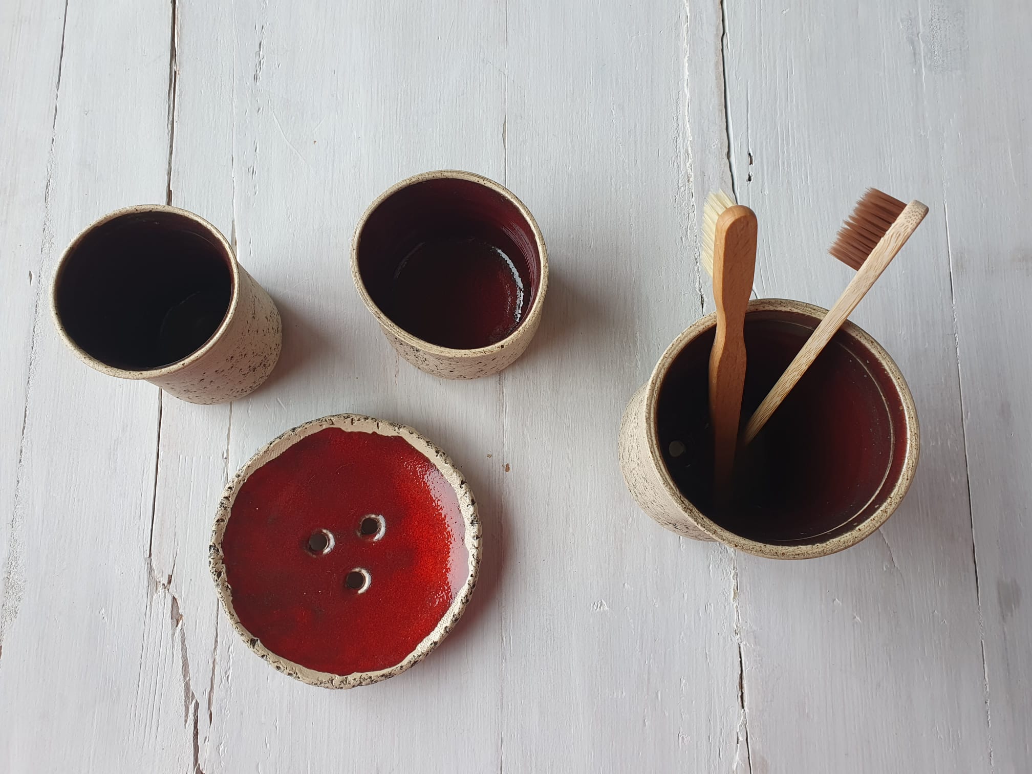 This specific set comes with a discount because one of the holes of the toothbrush cup filled itself with glaze in the kiln and is therefore 'missing'. Also, the cups are slightly overfired - meaning they became one tone to dark compared to the regular 'Playful Red'. These small imperfections are of no influence to the superior quality of the pottery.