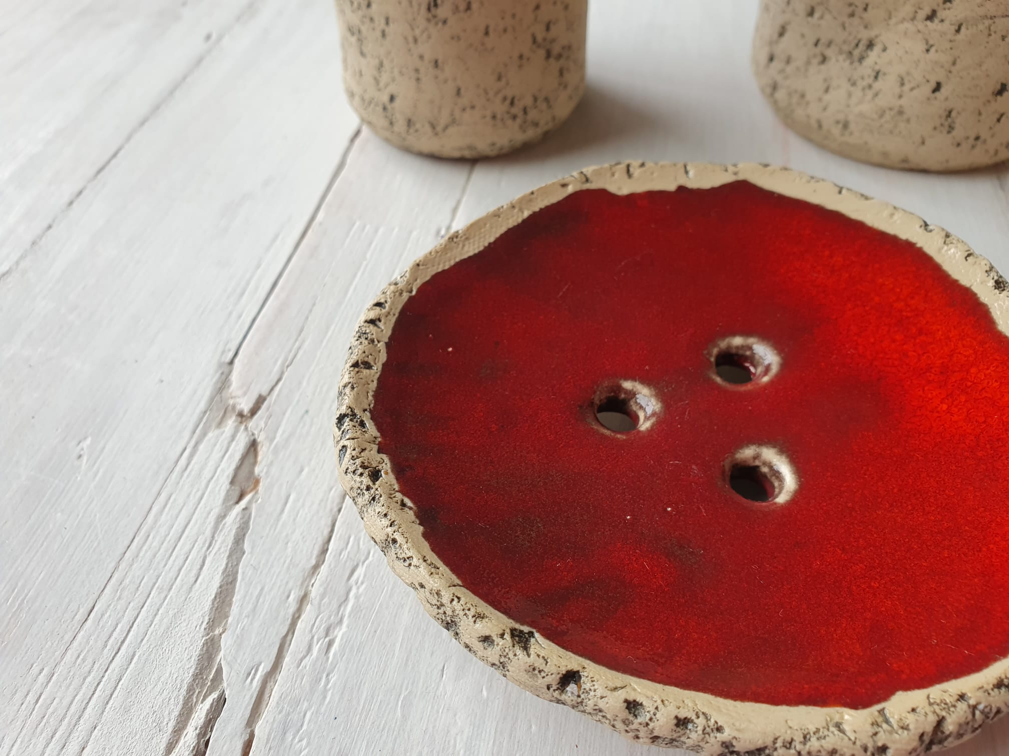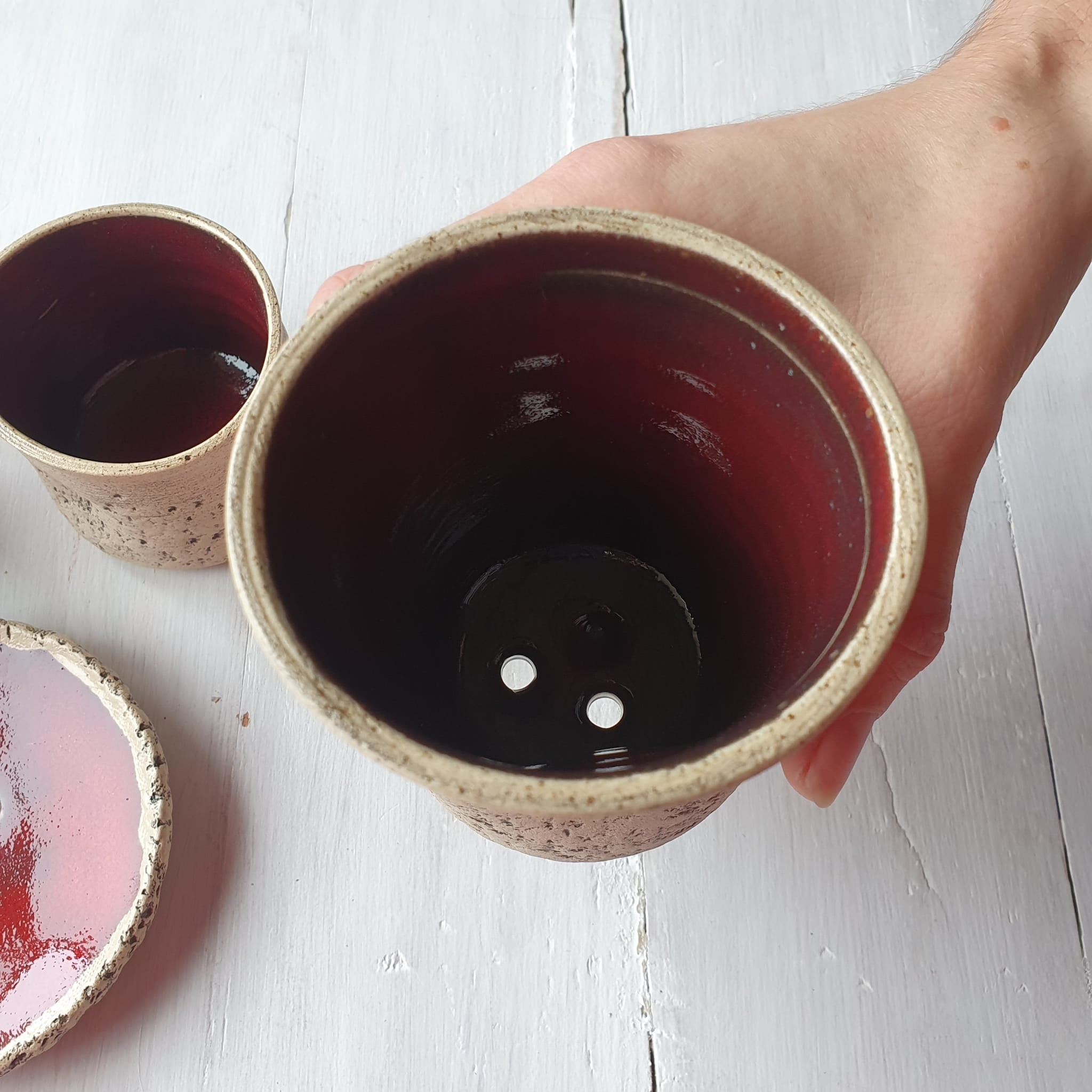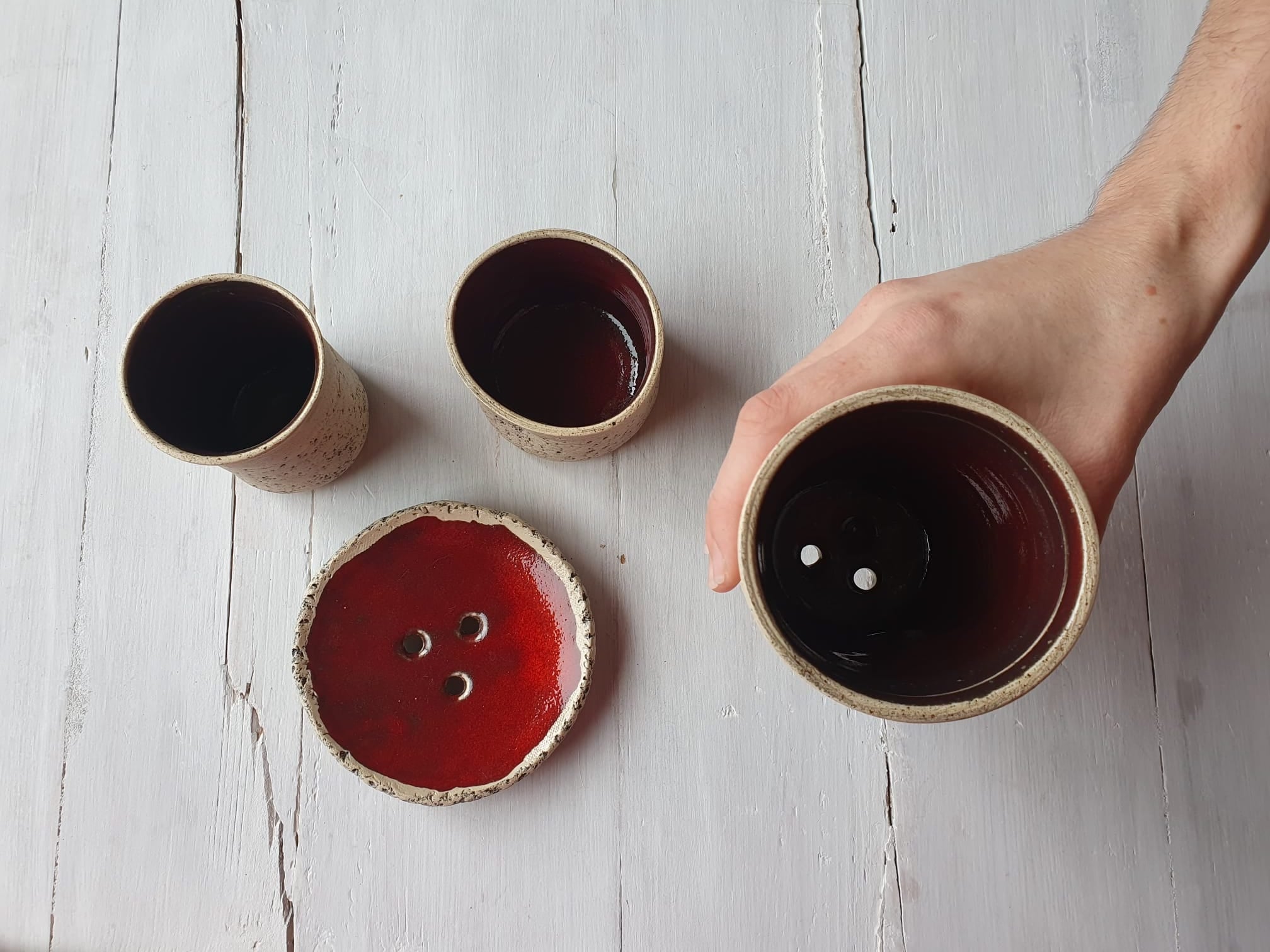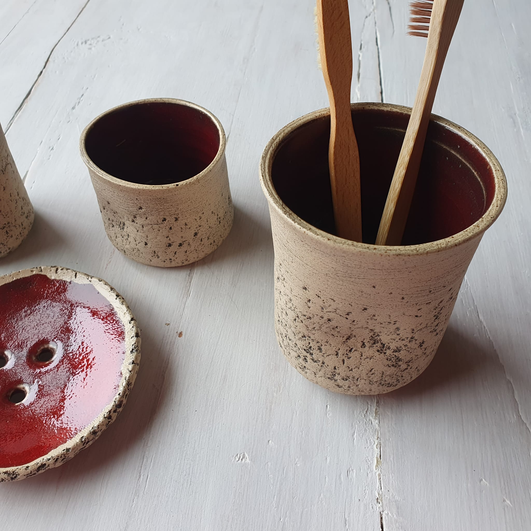 This specific set comes with a discount because one of the holes of the toothbrush cup filled itself with glaze in the kiln and is therefore 'missing'. Also, the cups are slightly overfired - meaning they became one tone to dark compared to the regular 'Playful Red'. These small imperfections are of no influence to the superior quality of the pottery.