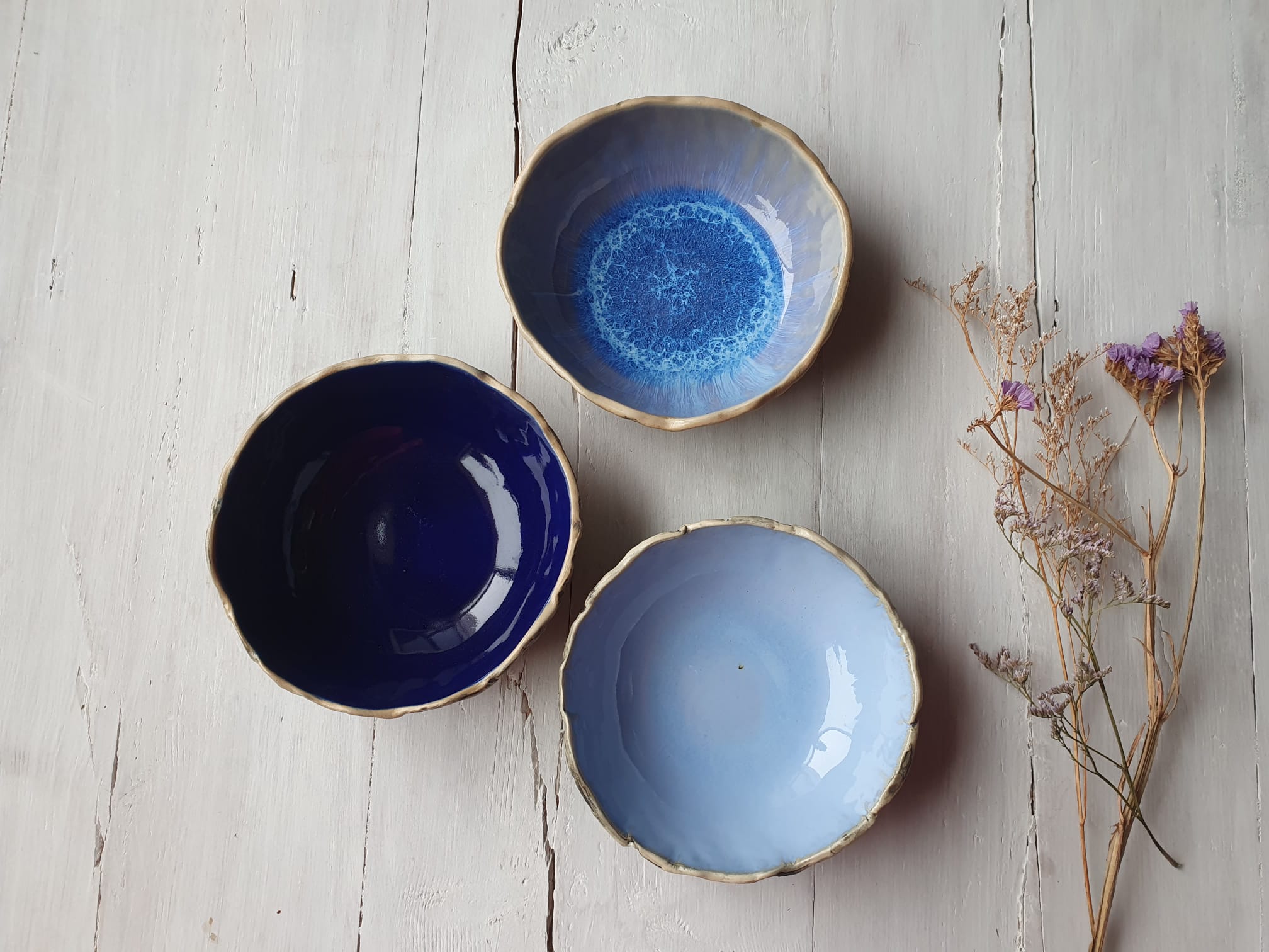 Handmade set of three unique bowls. Finished in three blue glazes - Sky blue, Indigo, and Waterfall. The Indigo bowl has some scratches, the Sky Blue one a freckle in the middle, and the Waterfall bowl has a superficial crack in the glaze. None of influence to the superior and longlasting quality of the pottery. Wonderful bowls, true conversation - starters and versatile beyond soup.